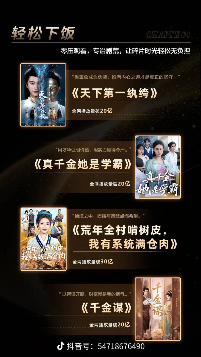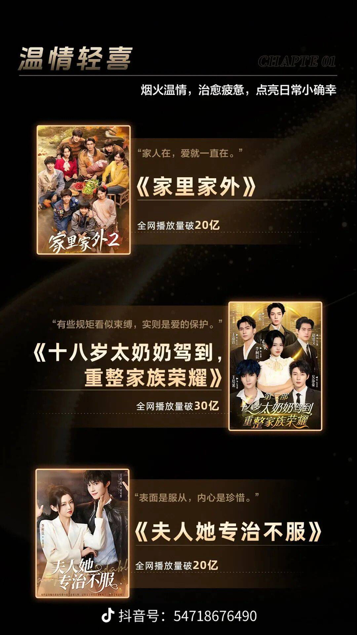 上榜短剧还有《家里家外》《十八岁太奶奶驾到,重整家族荣耀》《夫人她专治不服》《念念有词》《请君入我怀》《暗潮涌动》《一品布衣》《冒姓琅琊》《傩戏》《天下第一纨绔》《真千金她是学霸》《荒年全村啃树皮,我有系统满仓肉》《千金谋》。