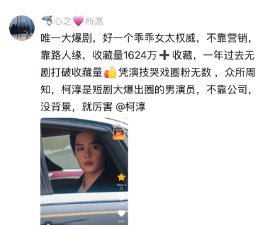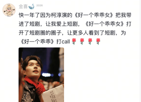 “快一年了因为柯淳演的《好一个乖乖女》把我带进了短剧,让我爱上短剧,《好一个乖乖女》打开了短剧圈的圈子,让更多人看到了短剧,为《好一个乖乖女》打call。”