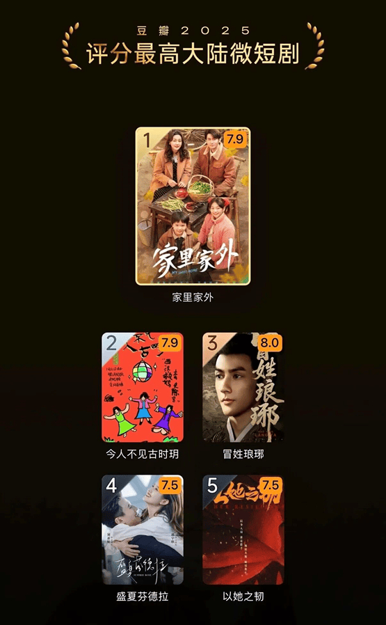 2025年12月23日,豆瓣2025年度剧集榜单公布,除“评分最高华语剧集”“评分最高英美续订剧”等例行排行榜外,还出现了“2025评分最高大陆微短剧”一项。据悉,这是微短剧首次列入豆瓣年度剧集榜单。