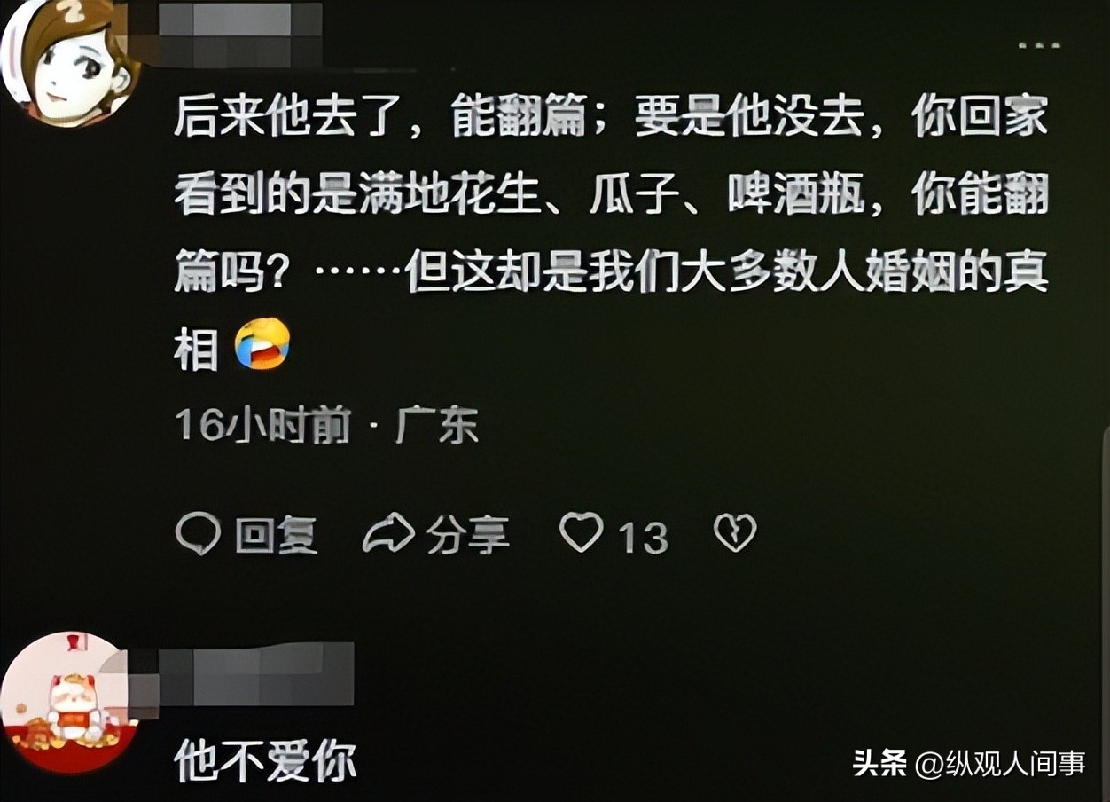 也有人戳中现实:“后来他去了,能翻篇;要是他没去,你回家看到的是满地花生、瓜子、啤酒瓶,你能翻篇吗?这却是我们大多数人婚姻的真相”;
