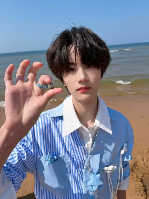 私人看海时,李煜东展现出职业身份外的本真状态。站姐生图捕捉到他独坐礁石的侧影,眉目间褪去舞台张力,呈现“清冷与元气交织”的反差感。这种松弛源于心理防御机制的解除——此前他面对舆论争议时,曾以“东不落”标签解构嘲笑,将外部压力升华为内在能量。而此刻的海边独处,恰是这种心理韧性的外化。