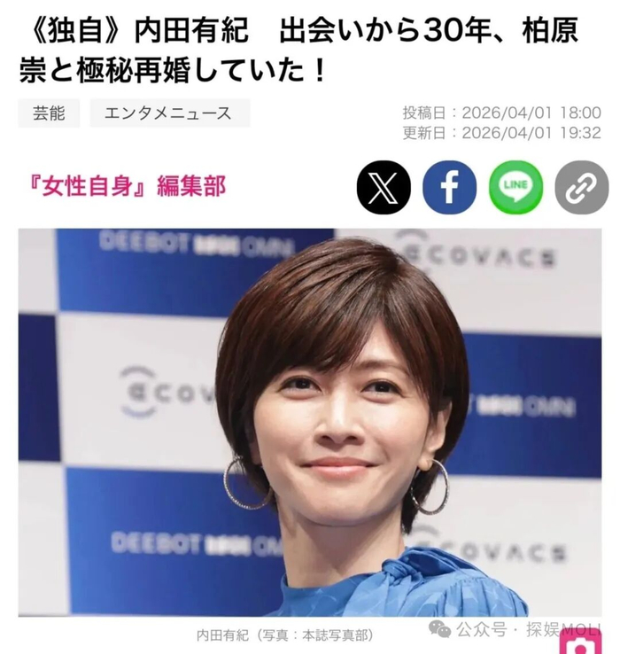 从广告初遇的心动,到好友相伴的默契,再到十六年相守的笃定,从台前偶像到幕后守护者,身份更迭,爱意未减。恭喜内田有纪与柏原崇,历经岁月沉淀,终成眷属,愿往后余生,三餐四季,安稳相伴,岁岁安康,幸福绵长。