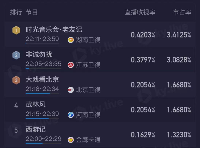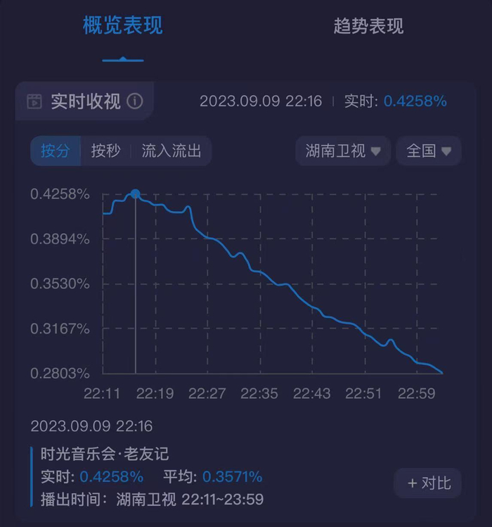 从酷云实时收视数据来看,《时光音乐会3》开播后收视突破0.4,峰值0.42,获得了同时段卫视收视冠军。但是这个数据并不是很好看,湖南卫视热播剧《装腔启示录》积累了不错的受众,而10点过后,节目收视就直线下滑,内容并没有留住这些受众。