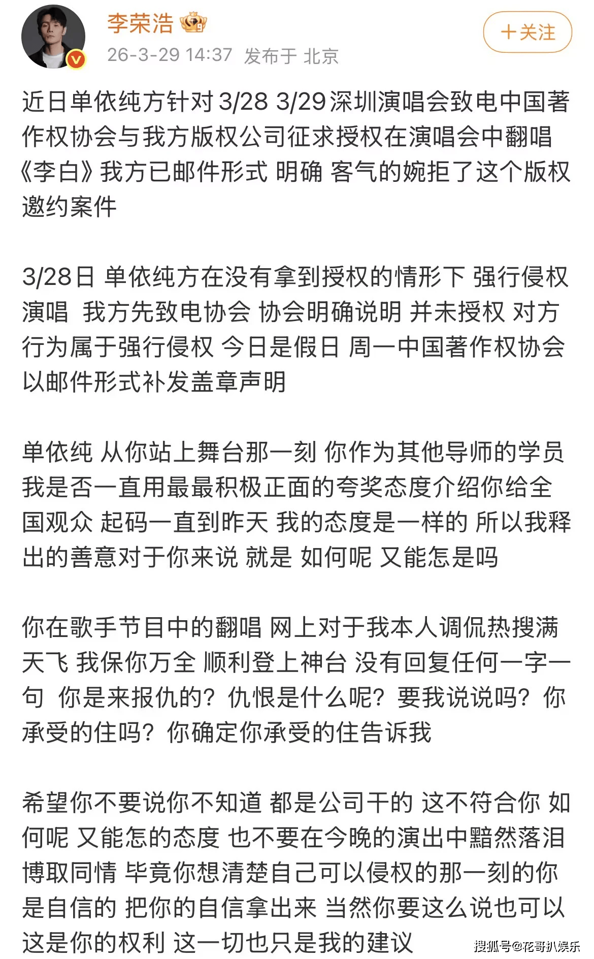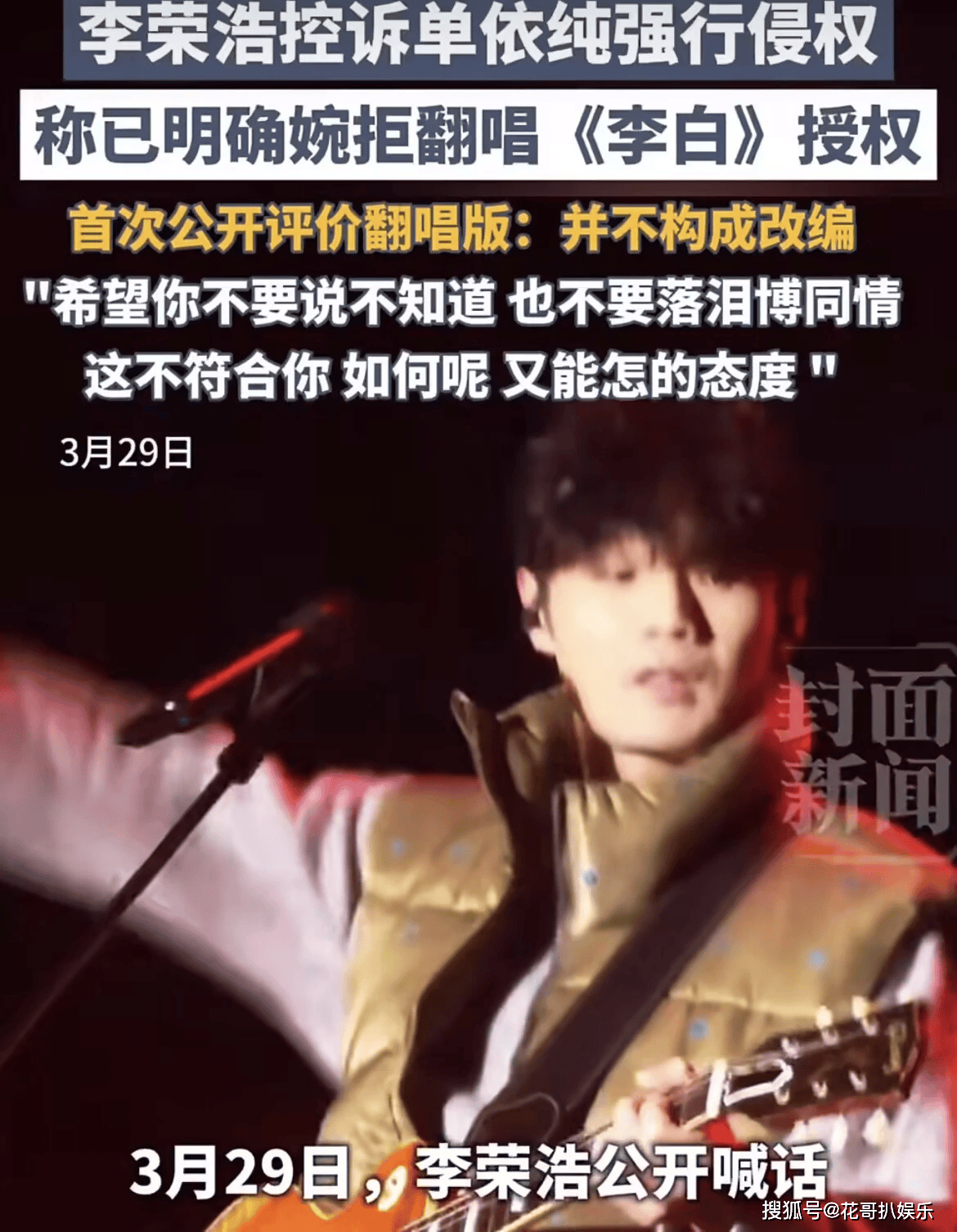 单依纯顺风顺水的人生终于迎来了当头一棒。前两天单依纯深圳巡回演唱会如期开唱,现场演唱李荣浩经典作品《李白》。唱得好不好听先放一边,问题是隔天李荣浩公开发声控诉,说单依纯团队早前已申请《李白》翻唱授权,自己明确拒绝后,对方依旧执意演唱,此举属于强行侵权,要求单依纯方给出正式说法。艺人下场亲自开撕,瞬间引爆热搜。