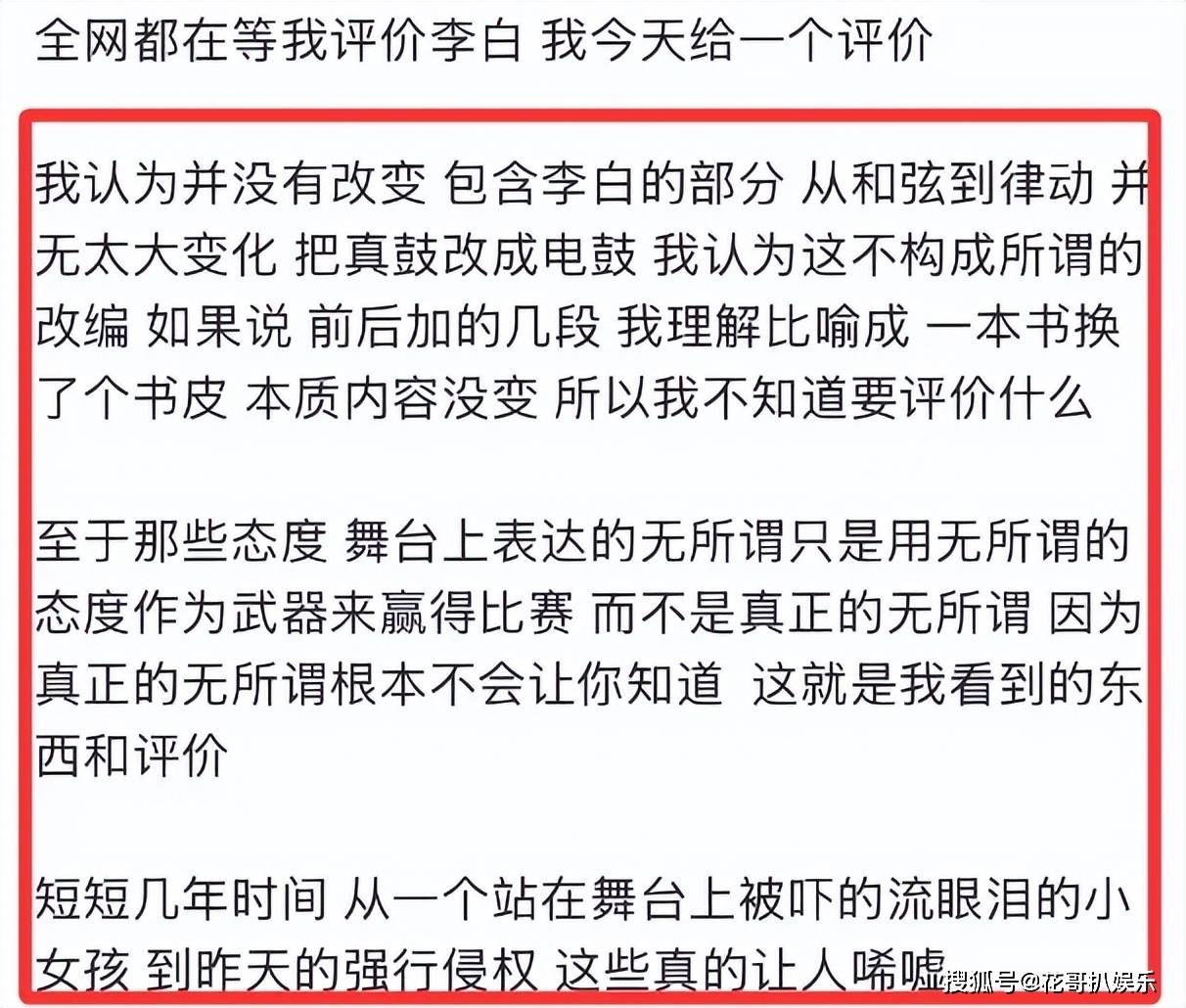 在控诉中,李荣浩不仅点明侵权事实,更毫不避讳地点评单依纯对《李白》的改编,直言其改动毫无技术性可言,唱功与创作能力也没有外界吹捧得那么出众。看得出来,李荣浩不仅对单依纯很失望,而且甚至已经开始厌烦她了,觉得她出道后被资本一路力捧,年少得志的她早已心态膨胀,不仅不懂感恩,反而愈发嚣张傲慢,甚至刻意借着翻唱前辈作品博眼球、吃红利。