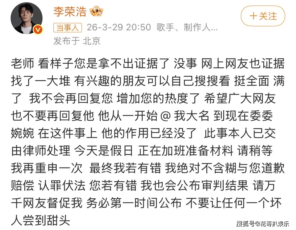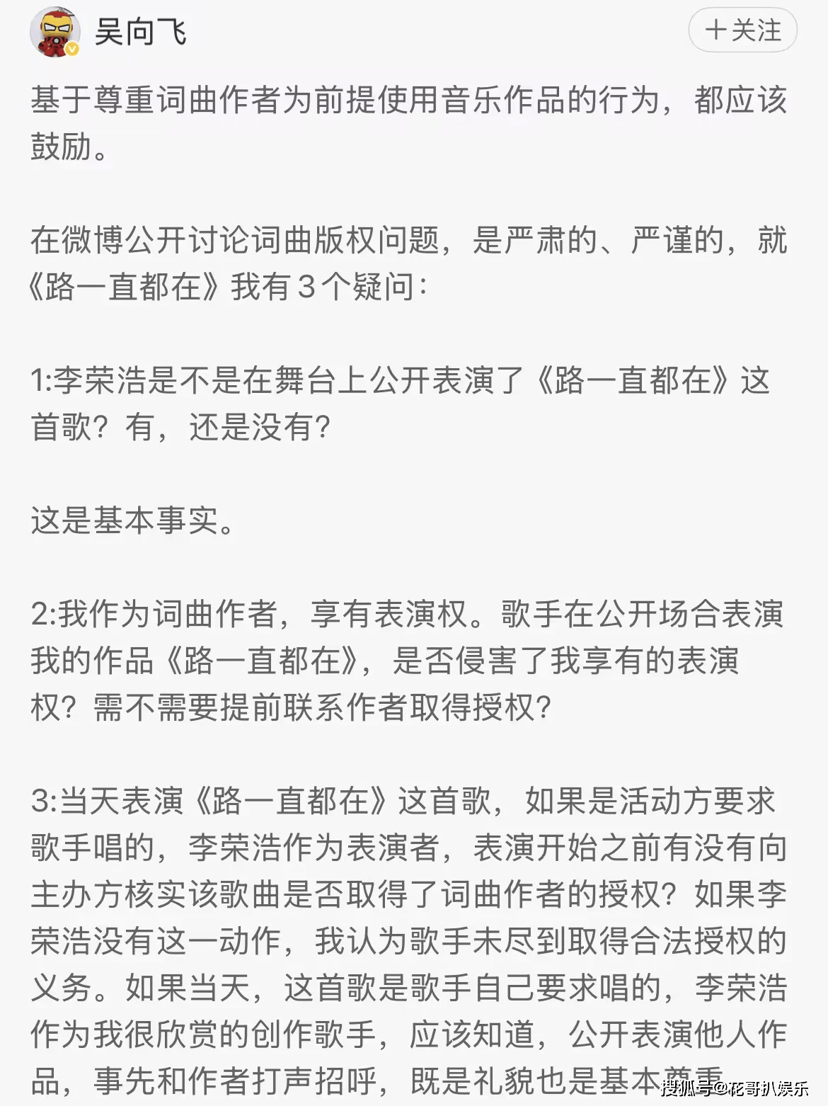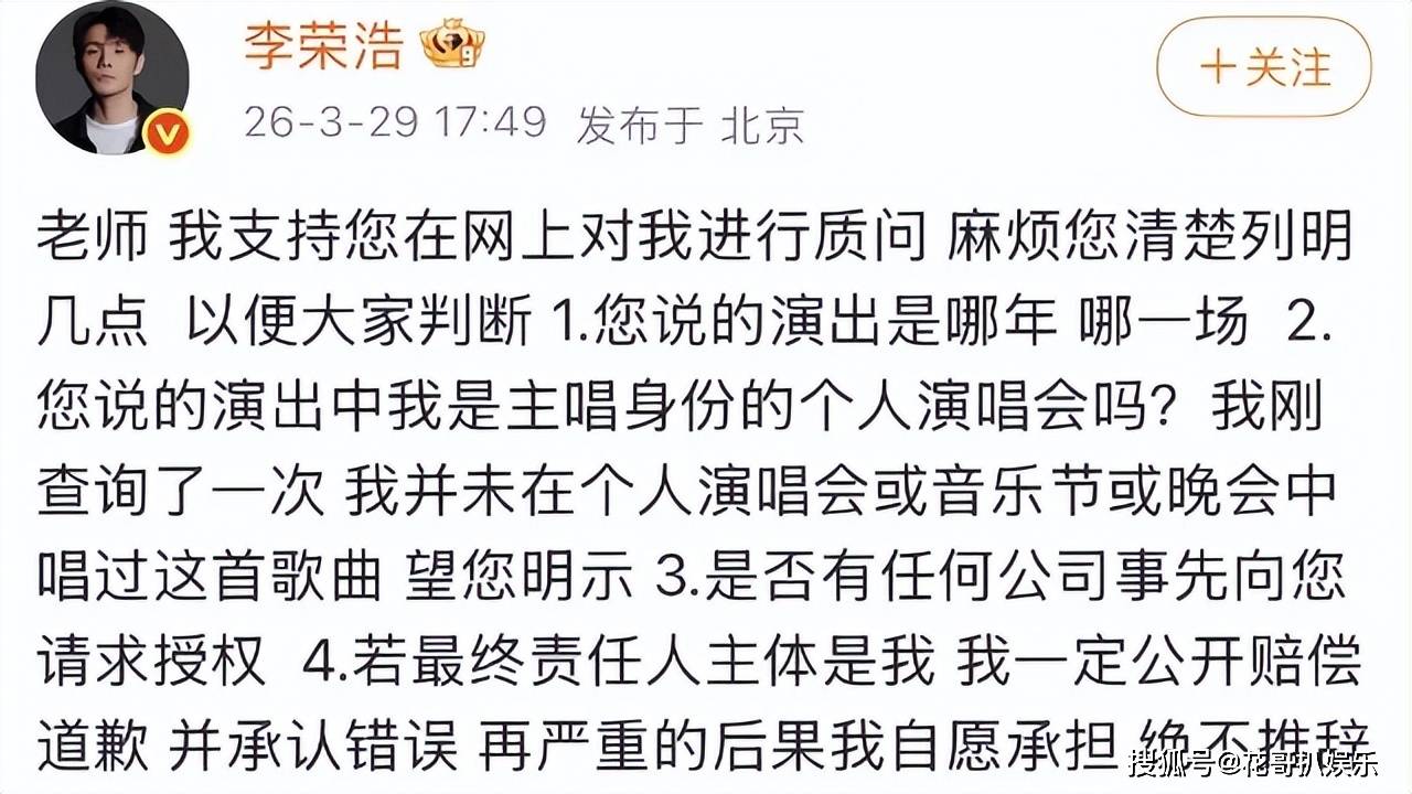 面对吴向飞的质疑,李荣浩没有回避,接连三次发文梳理事件疑点,摆事实讲道理,要求对方正面回应。说清楚是哪场演唱会,侵犯了他什么权益?