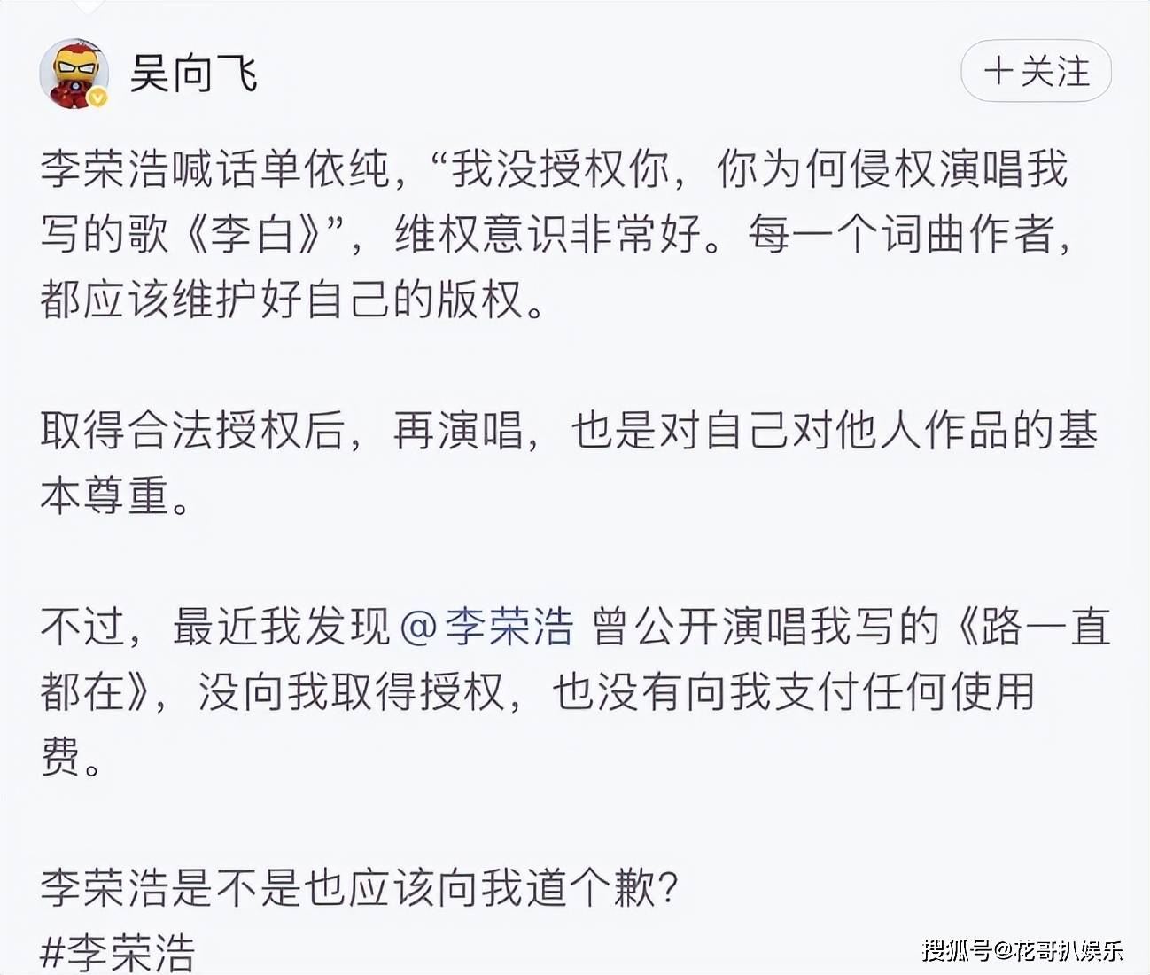 李荣浩的正面硬刚,迅速引发全网热议,舆论几乎一边倒支持版权方,指责单依纯侵权失当。而就在事件发酵之际,作词人吴向飞突然现身喊话,质疑李荣浩早年侵权演唱其作品《路一直都在》,试图转移舆论焦点,为单依纯解围。
