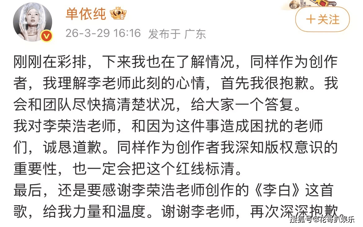 事件发酵后,单依纯虽发布道歉声明,但回应始终轻描淡写,将责任推给团队,避重就轻的态度,根本无法平息众怒。作为演唱会的表演者和制作人,她不可能对曲目授权情况一无所知,明知授权被拒依旧登台演唱,可以说是心存侥幸,也可以说是故意膈应李荣浩。在华语乐坛越来越重视版权的当下,音乐人的原创权益理应得到充分尊重,任何侥幸心理、刻意侵权的行为,都终将付出代价。