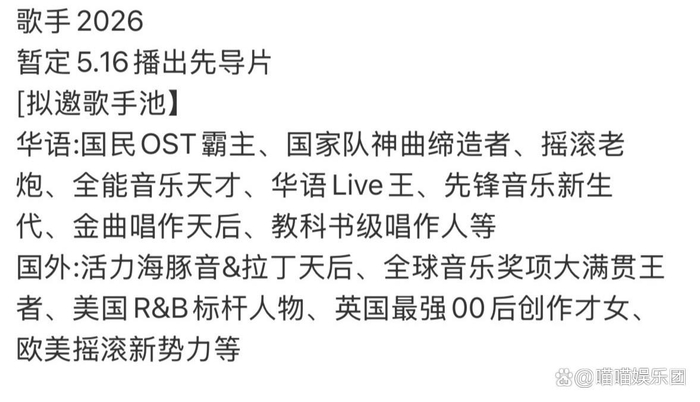 总而言之,根据拟邀名单来看,这季《歌手2026》早已超越普通音综的范畴,注定会成为年度爆款,书写华语音综的全新传奇。