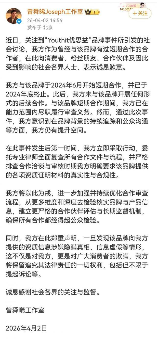 4月2日下午,曾舜晞工作室发文说明与优思益的合作情况。文中称,“我方与该品牌于2024年6月开始短期合作,并已于2024年底终止。”且此后没有后续合作。文中郑重声明,一旦发现该品牌提供的资质信息涉嫌隐瞒真相、信息虚假等情形,保留追究其法律责任的一切权利,包括但不限于提起诉讼等。