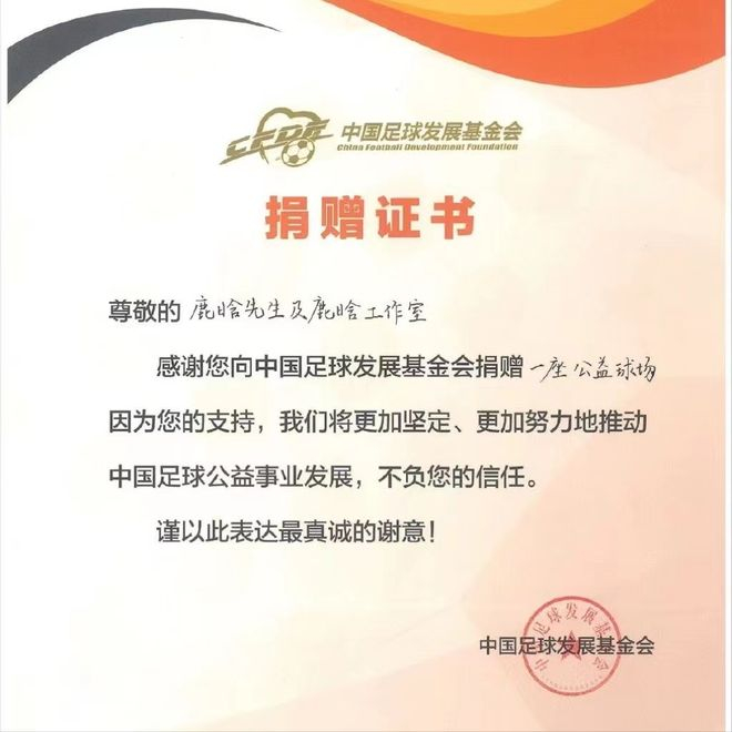 在过去的几年里,鹿晗通过中国足球发展基金会在全国各地捐建了13座公益足球场,包括北京、广州、广西、海南等城市。中国足球发展基金会官方表示,感谢鹿晗先生对青少年足球运动的持续支持,让更多的孩子喜欢上了足球,期待未来继续携手为中国足球发展贡献力量。