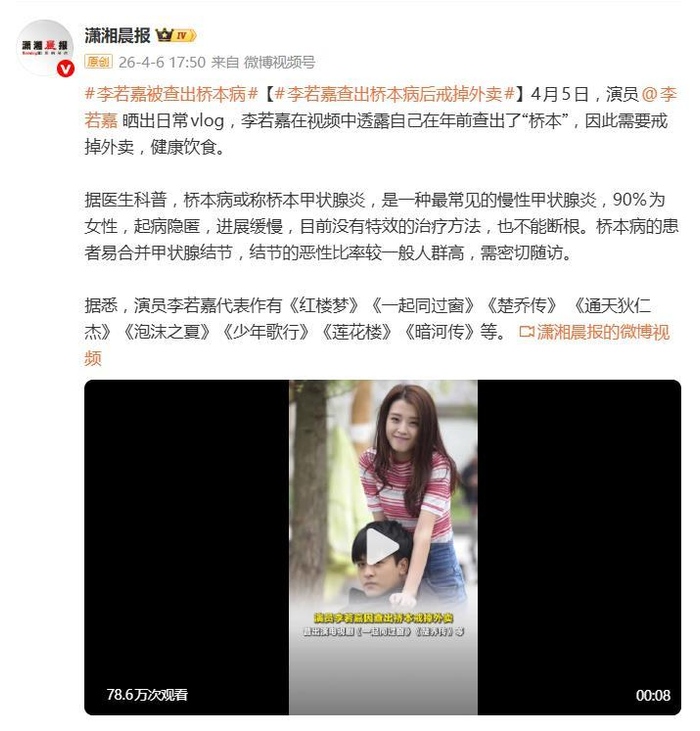 **吃瓜简评:李若嘉的健康自白与网友的反响**,演员李若嘉的一条健康相关的vlog引发了网友的热议,她在视频中淡然地透露,去年年初的体检结果发现自己患上了“桥本病”,这让这位曾经低调实力派的演员意外登上了热搜。,桥本病,又称桥本甲状腺炎,是一种常见的慢性甲状腺炎,患者中高达90%为女性,这种病性特点是起病隐匿、进展缓慢,目前既没有特效治疗方法,也无法彻底根治,更令人担忧的是,桥本病患者容易出现甲状腺结节,结节恶变的风险比普通人群要高,患者需要长期密切观察和管理。,消息一出,网友们纷纷表示“终于知道她为啥低调了”。“桥本病,原来不是表演的名场面。”“看来明星也不是铁打的,身体也是要好好对待的。”这些评论中充满了对李若嘉勇于面对困难的认可,同时也让人深思:在娱乐圈的快节奏中,明星们真的能兼顾事业和身体健康吗?,李若嘉在视频中分享了她的应对之道:果断戒掉多年依赖的外卖,开始尝试自己制作健康餐食,通过严格控制碘的摄入,调整饮食结构,她的病情已经有了明显改善,这番举动不仅展现了她个人的自律,也让网友们感动不已。“比起拼资源拼流量,能管住嘴、为自己健康负责的演员更难得。”“病魔才不管你是明星还是素人,健康饮食真的不是一句空话。”这些评论道出了当下年轻人亚健康状态的现实。,李若嘉的这次“自曝”,不仅仅是个人健康问题的曝光,更撕开了娱乐圈乃至当代年轻人亚健康状态的一角,高强度工作、不规律作息、长期依赖外卖,这些看似光鲜的生活方式,实际上正在让许多人身体亮起红灯,桥本病这种自身免疫性疾病的年轻化趋势,更是敲响了警钟。,李若嘉的健康vlog,或许比她在荧幕上的任何角色都更有现实意义,它提醒每一个人:在追逐事业与生活的路上,管理好身体才是最重要的“长期项目”,毕竟,健康的体魄,才是每个人最该悉心打造的“代表作”,看来,无论是红毯超模还是银幕大花旦,健康管理都是首要任务,能不能像李若嘉一样,勇于面对、从容应对?这或许就是每个人都需要思考的问题。**李若嘉的“健康Vlog”:明星自曝病症,网友:终于有人清醒了!**,一则关于演员李若嘉的健康消息引发了轰动,4月5日,李若嘉在社交平台分享了一段日常Vlog,意外让网友们看到了明星背后的“真实自我”,在视频中,这位曾多次出演热门剧的“低调实力派”淡然地透露,去年年初曾因桥本病(桥本甲状腺炎)被确诊,为了对症治疗,她不得不彻底告别多年依赖的外卖生活,开启了一段健康饮食的新生活。,### **桥本病:隐形杀手,年轻化威胁**,桥本病,医学名桥本甲状腺炎,是一种最常见的慢性甲状腺炎,患者中高达90%为女性,这种病性特点是起病隐匿、进展缓慢,且目前医学上无法彻底治愈,更令人警惕的是,桥本病患者容易出现甲状腺结节,结节恶变比率远高于普通人群,这类自身免疫性疾病的年轻化趋势,正在敲响越来越多年轻人的警钟。,### **“低调实力派”李若嘉:从红楼到清纯学姐的演员生涯**,李若嘉的演艺生涯可谓“名不见经传”,但她的代表作品却让人“一眼看中”,从新版《红楼梦》出道,到《一起同过窗》的清纯学姐,再到《楚乔传》、《通天狄仁杰》、《泡沫之夏》、《少年歌行》、《莲花楼》、《暗河传》等多部热播剧中,她都留下了深刻的印象,这次让她登上热搜的,竟然不是新剧的宣传片,而是一份诊断书。,### **从外卖到健康饮食:网友:终于有人清醒了!**,李若嘉的这次“自曝”,不仅让网友看到了明星的“真实面貌”,也撕开了娱乐圈乃至当代年轻人亚健康状态的一角,高强度工作、不规律作息、长期依赖外卖,这些看似光鲜的生活方式,正在让许多人身体亮起红灯。,网友们对李若嘉的这番“健康操作”给予了高度评价:“比起拼资源拼流量,能管住嘴、为自己健康负责的演员更难得!”“病魔才不管你是明星还是素人,健康饮食真的不是一句空话。”这些评论道出了当代年轻人健康意识的缺失与渴望。,### **“健康Vlog”的现实意义:打造属于自己的“长期项目”**,李若嘉的这份“健康Vlog”,或许比任何角色都更有现实意义,它提醒所有人:在追逐事业与生活的路上,管理好身体才是那个最不能NG的“长期项目”,健康的体魄,才是每个人最该悉心打造的“代表作”。,桥本病等自身免疫性疾病的年轻化趋势,不仅是个人健康的警示,更是整个社会需要警惕的公共卫生问题,无论是娱乐圈还是普通大众,都需要重新思考生活方式与健康管理的关系。,### ***,李若嘉用自己的经历告诉我们:真正的“清醒”不在于粉红的外衣还是闪闪的红毯,而在于对自己的身体负责,希望更多明星和普通人都能像李若嘉一样,学会用健康的方式“打造自己”,让每个人都能活出精彩的“代表作”,毕竟,健康的体魄,才是最重要的“长期项目”。