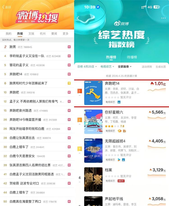 4月24日当晚,节目开播即引爆全网热度,斩获四大平台主榜热搜36个,微博综艺热度指数破亿,登上酷云、欢网、猫眼电视综艺等多榜实时榜首,登顶爱奇艺、优酷、腾讯三大视频平台综艺榜单,实现多平台热搜霸榜。