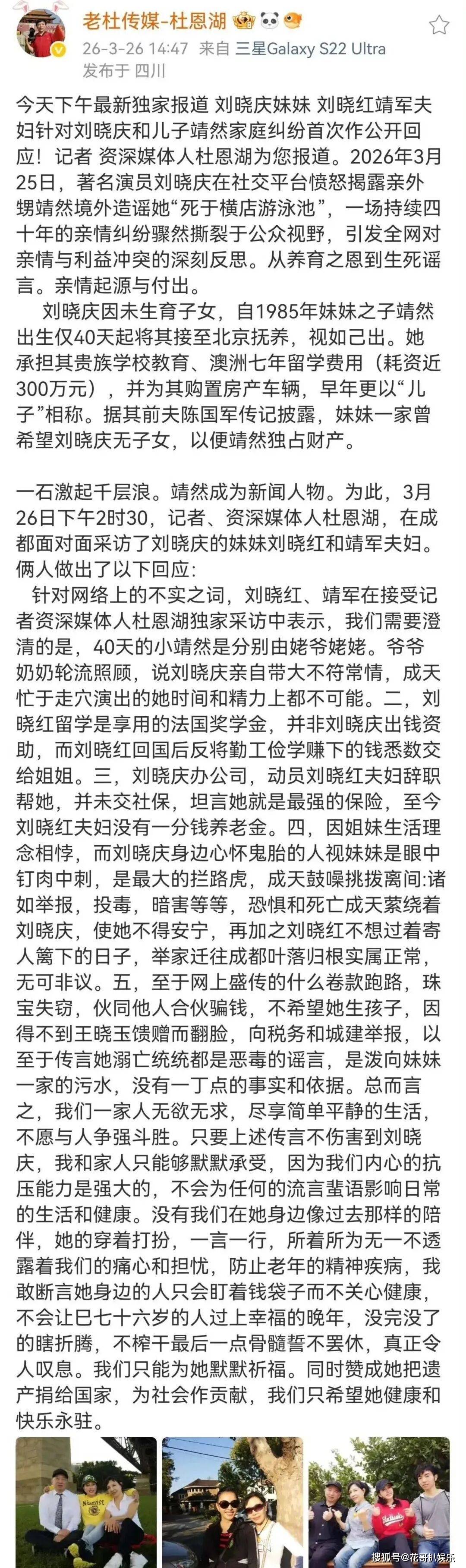 刘晓红之所以这么闹,不就是为了钱么,有人透露刘晓庆曾口头承诺,将全部遗产留给外甥靖然。然而,2012年她与富商王晓玉再婚,2025年公开宣布将自己的家产给电影事业,彻底打破了妹妹一家坐享其成的美梦。当巨大的利益预期化为泡影,亲情的小船说翻就翻。从亲密无间到对簿公堂,血缘亲情又如何,终究还是说破裂就破裂了。估计也真的是急昏了头,才想出这种办法,真的是没有办法的办法了,可能觉得败坏了刘晓庆的名声,刘晓庆就认栽了吧。