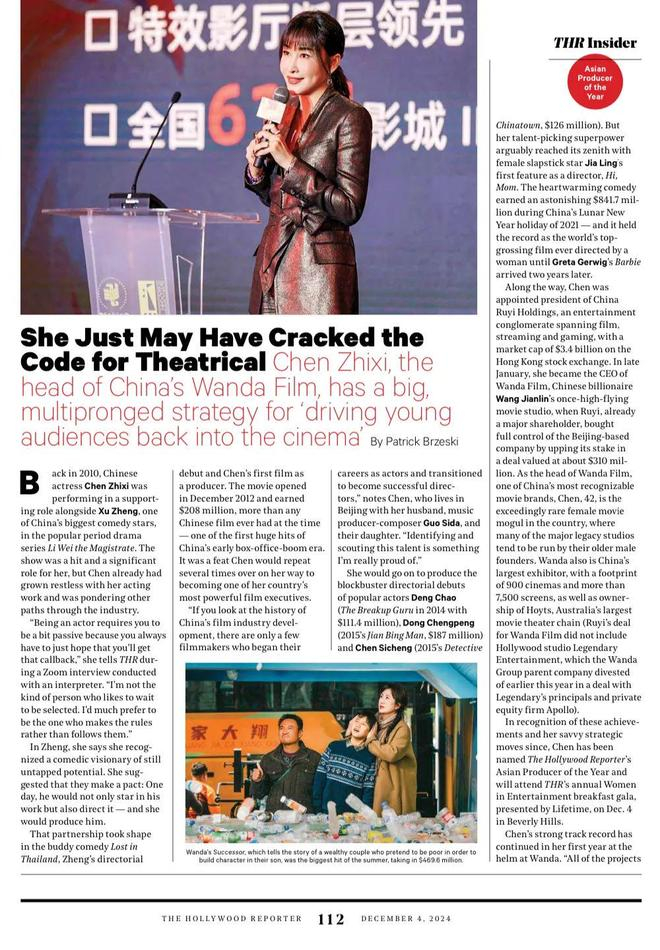 据时光网报道,北京时间12月5日,万达电影董事长兼总裁陈祉希,在《好莱坞报道》(The Hollywood Reporter)年度评选,《娱乐行业百大权力女性》特刊中,获“亚洲年度电影制片人”奖项,成为首位斩获该奖项的中国影人。