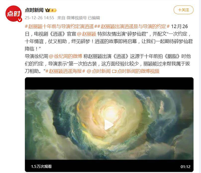 12月26日,电视剧《逍遥》宣布赵丽颖将特别友情出演碎梦仙君一角。随之发布的文案一次约定,十年情谊,仗义相助,终见碎梦,立刻引发了全网关于内娱真友情的热议。赵丽颖随后用九个字回应:约已赴,梦未碎,情义在,她的这番话也被网友称为侠气十足的典范。 这次赵丽颖的出演并非简单的客串。导演徐纪周在采访中透露,这一切源于十年前两人合作《胭脂》时的一个约定。当时他决定挑战执导古装剧《逍遥》,自认为经验比较少,赵丽颖二话不说就答应了他的请求,为他拔刀相助。为了履行这份承诺,赵丽颖特意调整了自己的档期,还配合剧组两次推迟开机时间,甚至成为古装小导师,分享拍摄经验。导演在感慨之余引用《爱丽丝漫游仙境》中的台词:所有最棒的人都是这样。可以说,这段十年深厚的友情在娱乐圈中真是独树一帜,令人动容。