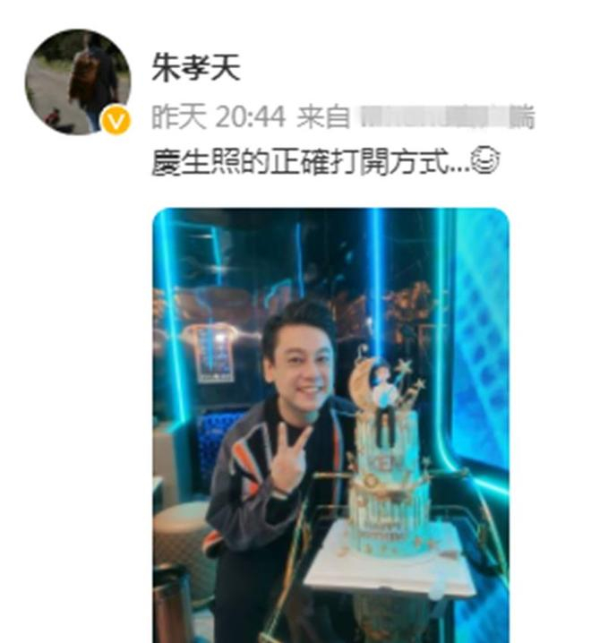 到了晚上,估计是庆生结束后,朱孝天发了自己和生日蛋糕的合照,还说“庆生照的正确打开方式.......”哈哈哈,朱孝天不怕被人说老了丑了,勇敢地面对自己的老去,这样的心态非常好非常健康。