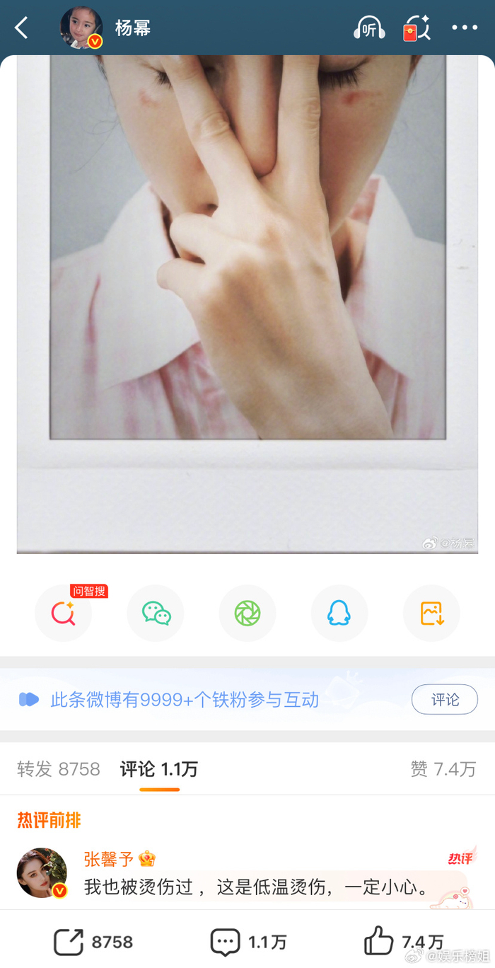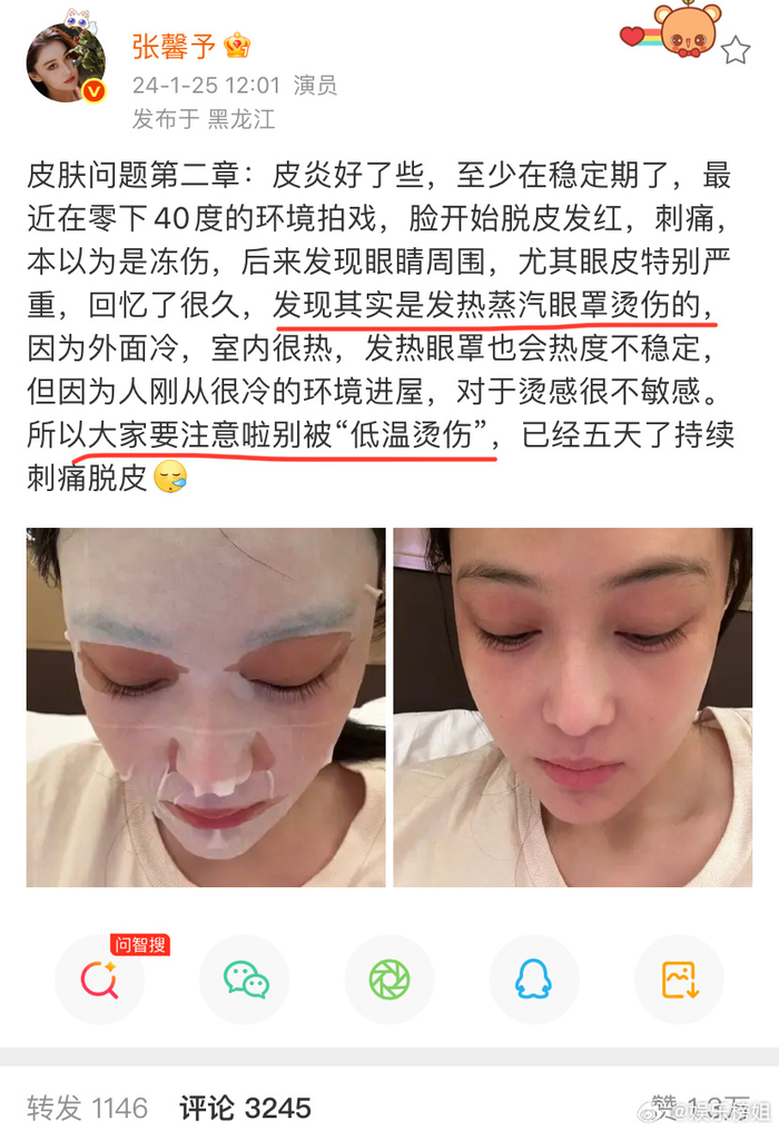 #张馨予也被蒸汽眼罩烫伤过# 张馨予评论杨幂:“我也被烫伤过,这是低温烫伤,一定小心。” 谢谢姐姐善意的提醒,大家用发热的蒸汽眼罩都要注意安全