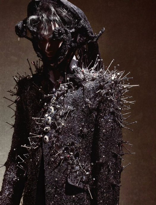 机械羽翼与钉子:断裂的黑色羽翼象征被禁锢的自由渴望,布满钉子的服饰具象化外界施加的伤害,绷带缠绕的躯体暗示伤痛与修复的共生;
