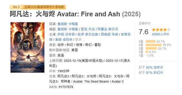 作为对比,前作《阿凡达:水之道》目前评分是7.8分,第一部评分则是8.8分。