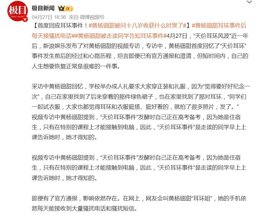 一场成人礼上随手拍的照片,谁能想到会演变成一场席卷全网的舆论风暴?据4月27日报道,时隔近一年,因“天价耳环”被推上风口浪尖的18岁演员黄杨钿甜,终于在近日接受了新浪娱乐的视频专访,首度开口回忆了那场风波的前前后后。