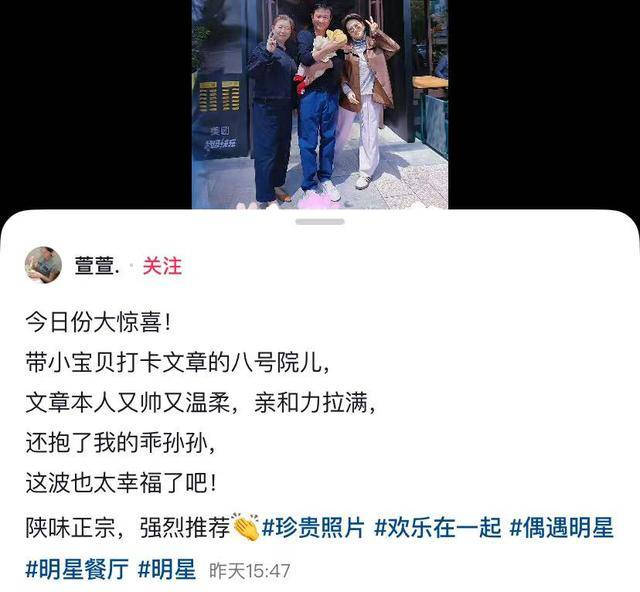 这几天也陆陆续续有去餐馆吃饭的人兴奋晒与文章合影,自觉乖孙被文章抱了抱很幸福,大赞餐馆陕味正宗,推荐到位。