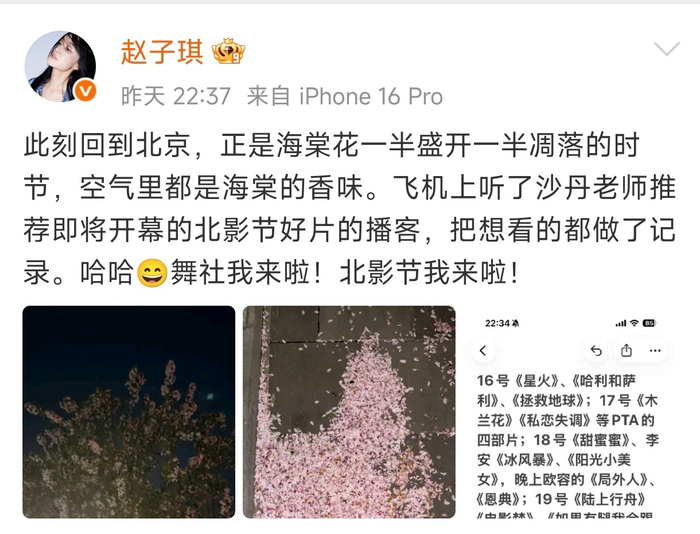 #赵子琪离开浪姐被北影节吸引##赵子琪把北影节想看的都记录了#淘汰从不定义精彩,赵子琪在离开浪姐后被北影节好片吸引,用心记下每一部想看的电影,直接规划出9天完整看片行程,在电影世界里感受不同故事,活出松弛又自在的状态。