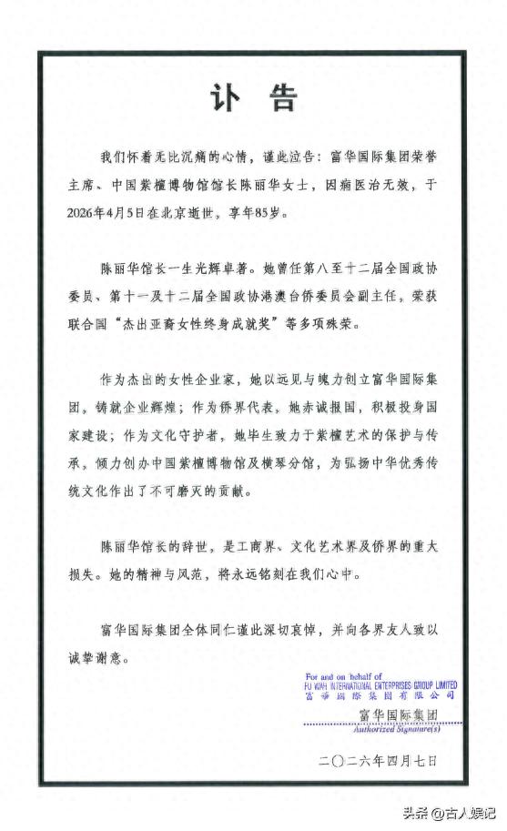 2026年4月7日,富华国际集团发布讣告,陈丽华因病在北京逝世,享年85岁。