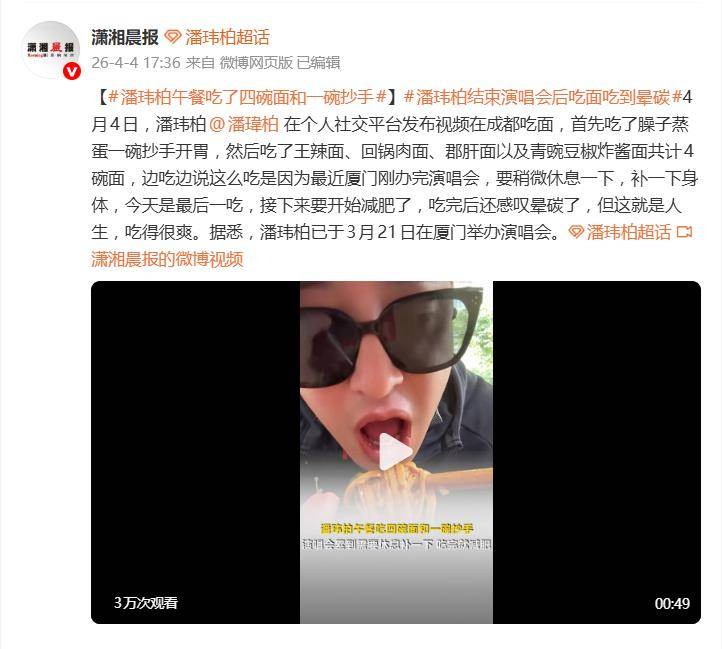4月4日,歌手潘玮柏在个人社交平台发布的一则美食vlog,瞬间点燃了网友们的笑点。视频里,他上演了一场堪称“碳水盛宴”的成都吃面直播,并幽默宣布这是“今天最后一吃,明天开始减肥”,让无数正在节食与美食间挣扎的网友直呼“世另我”。