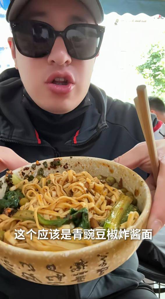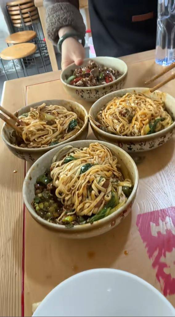 热身完毕,真正的“主菜”才重磅登场——他接连品尝了回锅肉面、郡肝面以及青豌豆椒炸酱面,王辣面,共计四碗各具特色的成都面条。