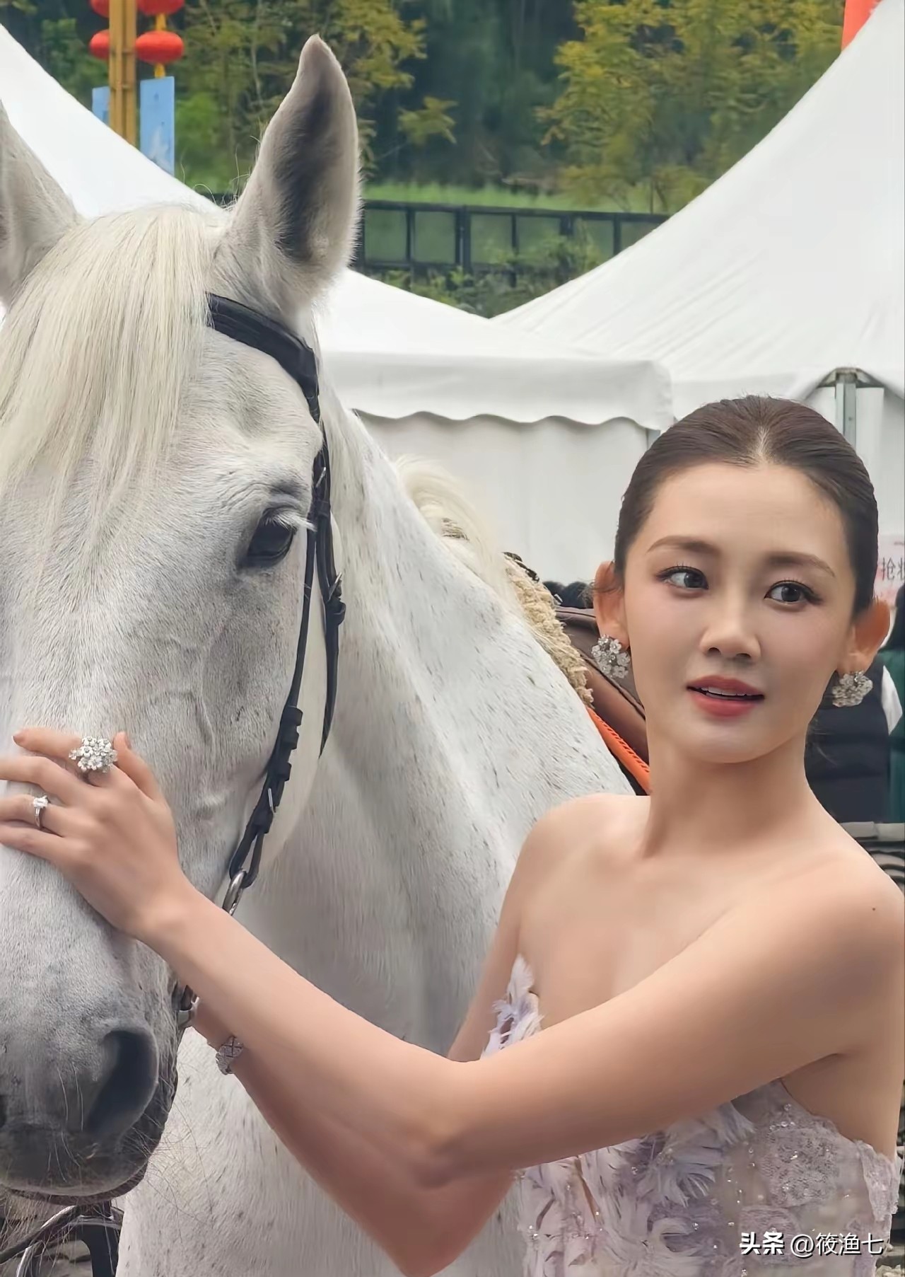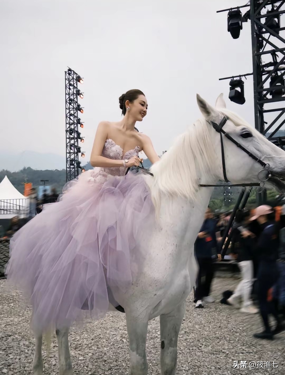 在个人的独照中,一身紫色纱裙的苗苗美的不可方物,坐在马上的她有不失英气,真的太抗老了吧。