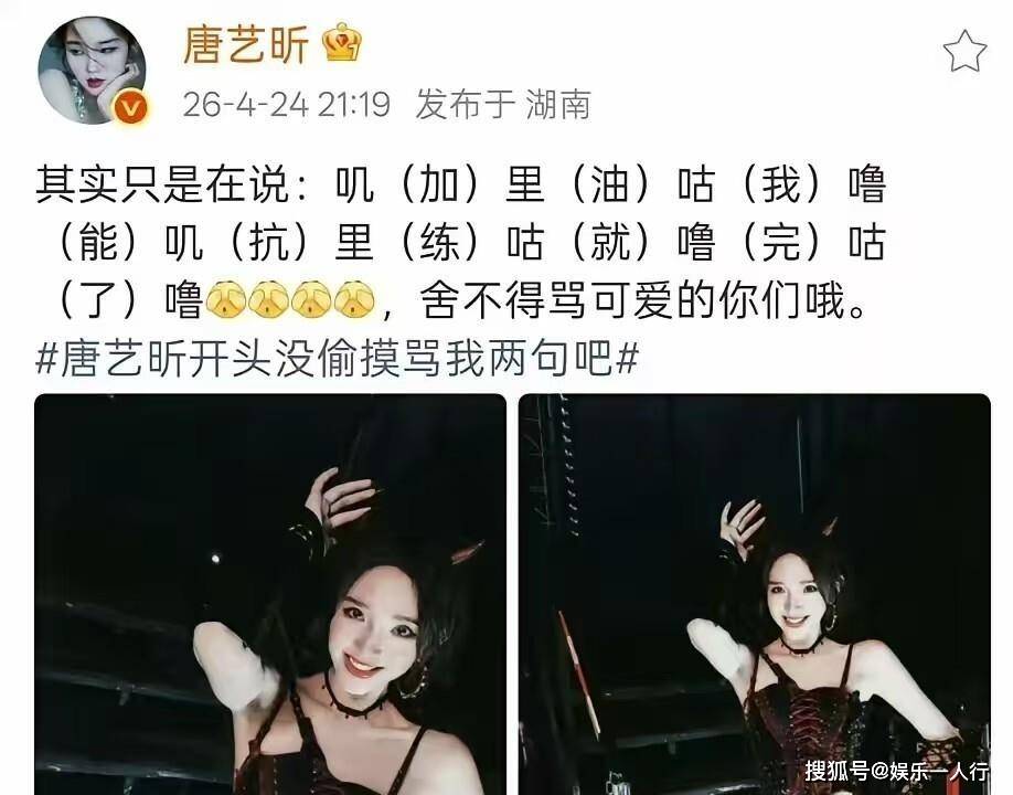 唐艺昕在4月24日21点19分发布微博回应。 她用谐音梗拆解那段模糊的发音:“其实只是在说:叽(加)里(油)咕(我)噜(能)叽(抗)里(练)咕(就)噜(完)咕(了)噜,舍不得骂可爱的你们哦。 ”原唱希林娜依高在评论区留言:“是词烫嘴! 不怪你们! ”唐艺昕回复:“原唱sorry。 ”