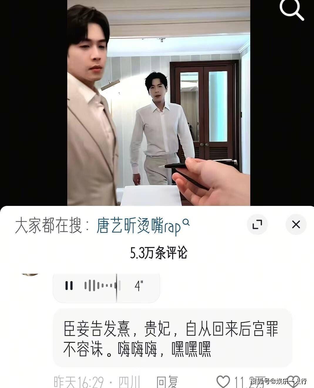 张若昀的评论区在4月25日彻底沦陷。 网友的创意分为三大流派。 第一类是“甄嬛传团建”,把唐艺昕在《甄嬛传》中饰演的祺贵人台词进行改编:“臣妾要告发祺嫔唱嗨呀呀秽乱后宫”“快去请皇上来,祺嫔又梦魇了”。 有人直接发送语音消息,模仿唐艺昕那段“烫嘴rap”的腔调。