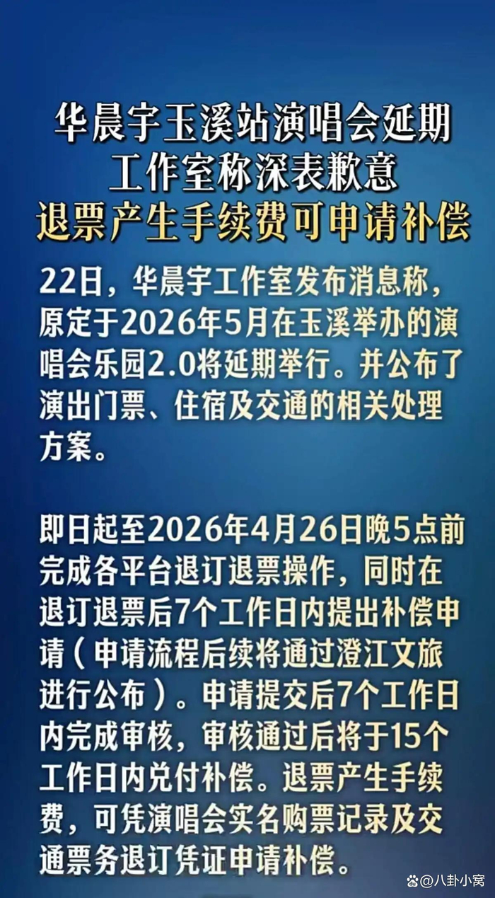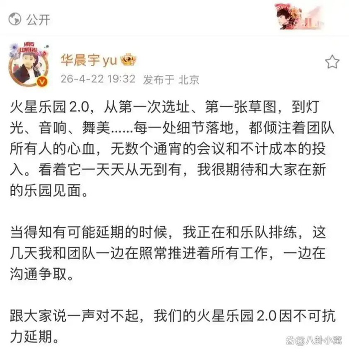 2026年的“五一”假期前夕,云南玉溪抚仙湖畔原本应该响起的音乐声戛然而止。就在距离开演仅剩不到10天的时候,华晨宇工作室在4月22日晚间突然宣布,原定于5月1日至5日举办的“火星演唱会乐园2.0”因不可抗力延期。