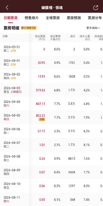 4月5日清明节当天,票房实现罕见“逆跌”:猫眼与灯塔数据同步显示,单日票房达852万以上,超越前一日成绩;