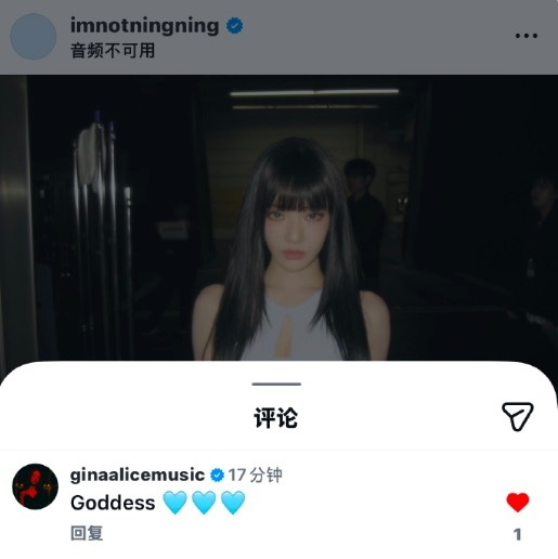 吉娜·爱丽丝近日在宁艺卓的Instagram动态下热情留言称赞其为"辣妹"和"女神",并晒出两人亲密合照引发广泛关注。