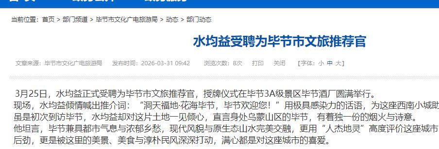 当天,水均益穿着正装,笑着接过聘书,还对着镜头为毕节文旅宣传,语气亲和接地气,依旧是观众熟悉的模样。