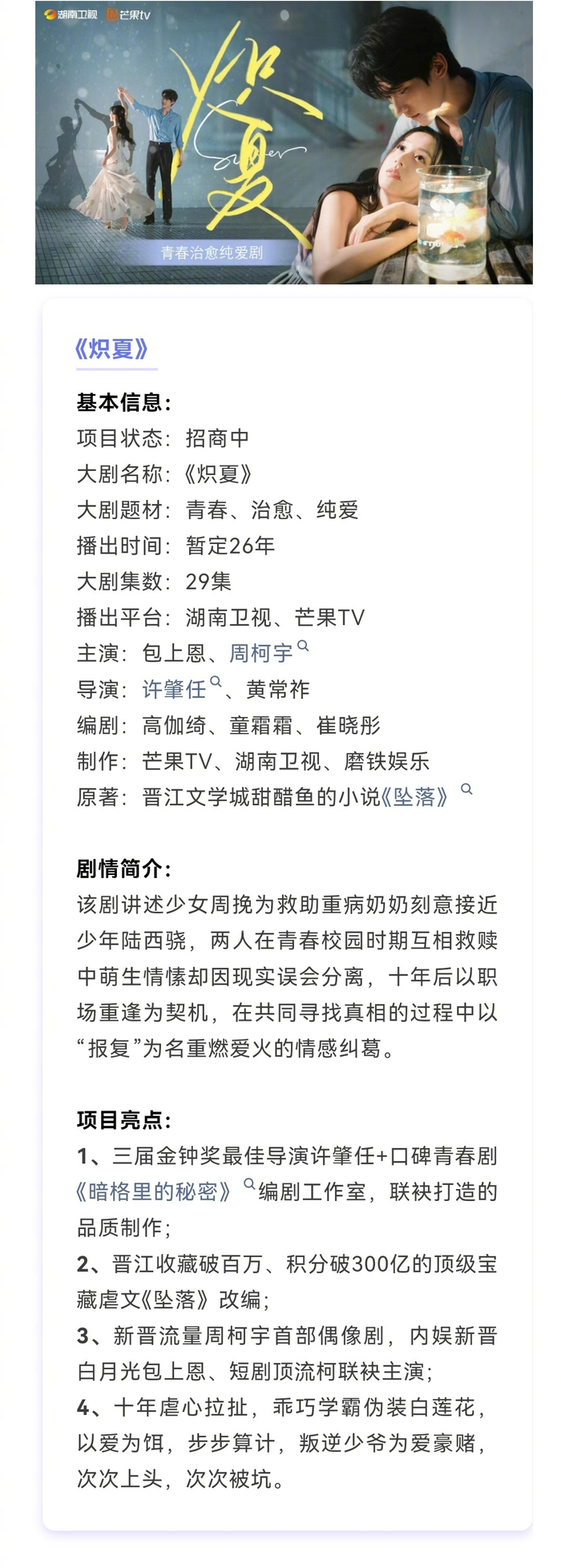 i现偶注意!包上恩、周柯宇《炽夏》预计6月登陆湖南卫视&芒果TV。