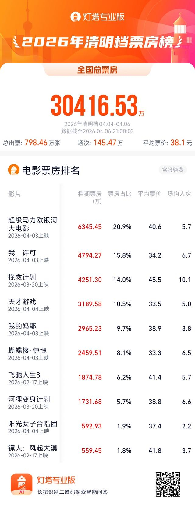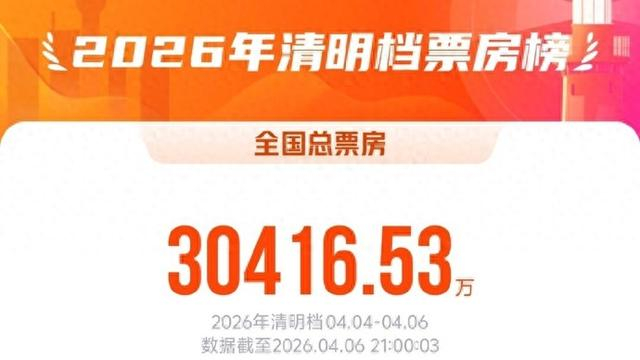 据灯塔专业版统计,截至4月6日21时,2026年清明档(4月4日-6日)票房3.04亿元,影片《超级马力欧银河大电影》成为清明档票房冠军。