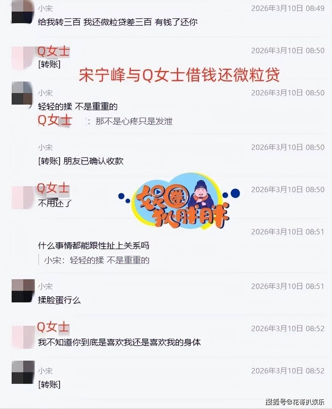 宋宁峰真的是个很low的人,按照爆料中的内容显示,宋宁峰曾向圈外Q女士借款三百元用于偿还网贷,三百块钱不算个什么,最主要的是他说话方式实在让人难以接受,在与Q女士的往来中,他全然不顾已婚身份,言语间频频越界,话题低俗露骨,毫无边界感与道德约束,两人甚至互发私密照片,看完这聊天记录感觉眼睛都脏了,很难想象这个人有没有进化完全。