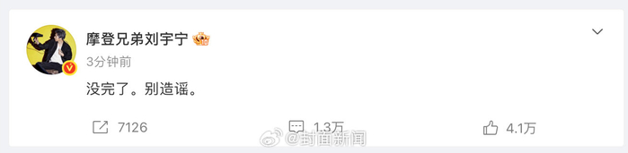 【#刘宇宁辟谣恋情传闻#:别造谣】#刘宇宁怒怼谣言#4月23日,@摩登兄弟刘宇宁 发文辟谣恋情传闻:没完了。别造谣。