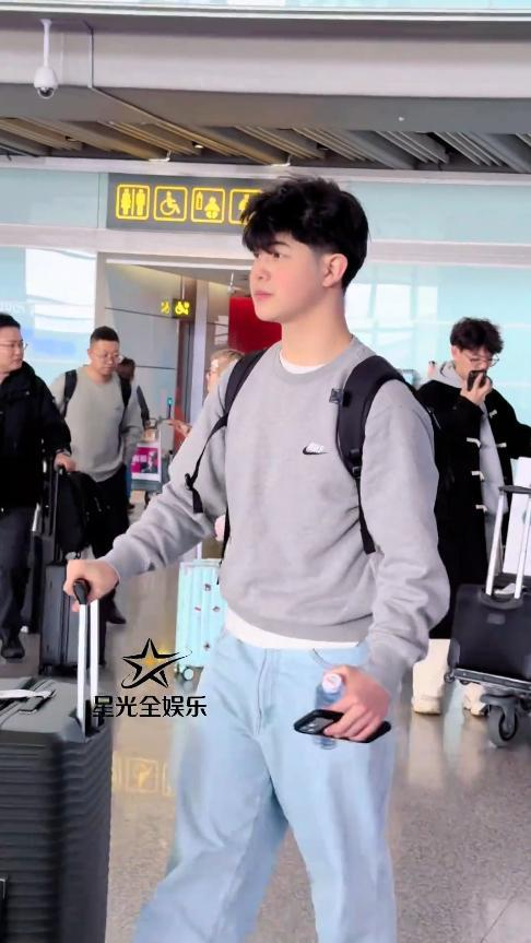 他当天穿了一件灰色圆领卫衣,搭配浅蓝色牛仔裤,背着一个黑色双肩包,穿搭简单干净,浑身透着少年的清爽感。