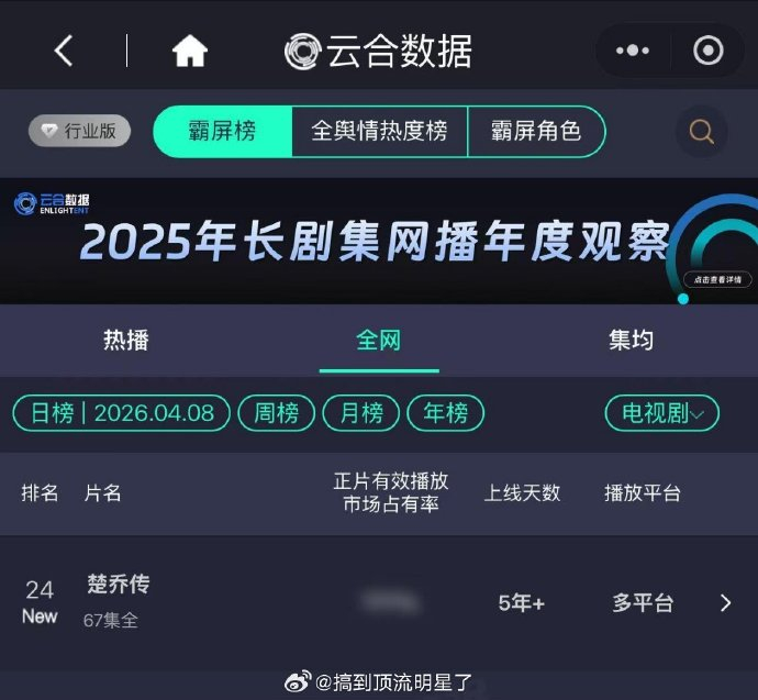 《楚乔传》作为现象级爆款剧,其历史播放数据与当下热度仍在行业内保持断层领先地位——热播期集均2.49亿的播放量至今未被超越,而2026年4月因续作《冰湖重生》开播引发的怀旧潮,更推动该剧重回云合数据霸屏榜前列。
