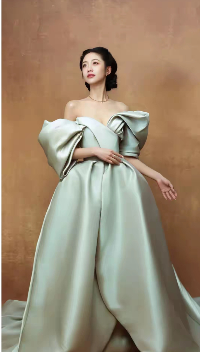 · 礼服:她身着一款香槟色(或描述为简约鎏金色)的抹胸长礼服,设计简约,富有光泽感。