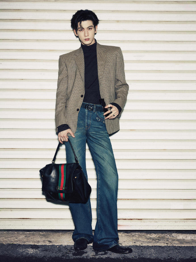 张凌赫身穿格纹西装搭配经典老花元素,190cm身高加持下展现出冷峻贵公子气质,被粉丝称为“夜色掌控者”。