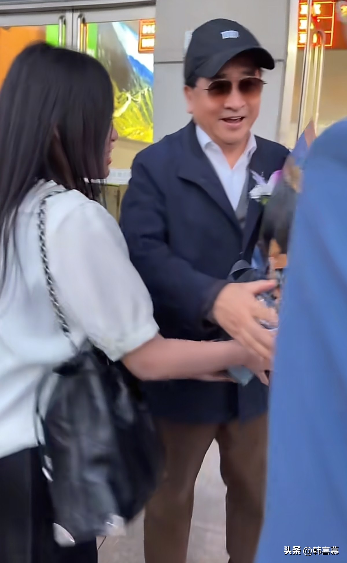 一位穿白色衣服的美女,早早的就等在外面,看见姜昆出来,赶紧上前送给他一束鲜花。