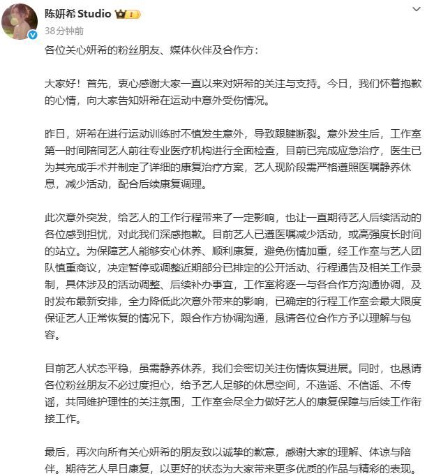 3月31日,@陈妍希Studio 发文表示,演员陈妍希在进行运动训练时不慎发生意外,导致跟腱断裂,目前已完成应急治疗,医生已为其完成手术并制定了详细的康复治疗方案,艺人现阶段需严格遵照医嘱静养休息,减少活动,配合后续康复调理。