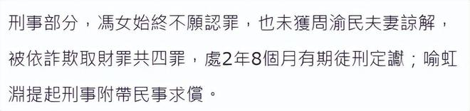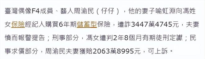 据了解,喻虹渊在2018年通过闺蜜冯某某给家人买了6年的高储蓄保险,陆续转账3447万台币,几年后才发现被诈骗损失惨重。去年7月,法院判冯某某有期徒刑2年8个月,但大部分钱都被她花掉了,周渝民夫妇只拿到2063万台币的赔偿,仍亏损一千多万台币。