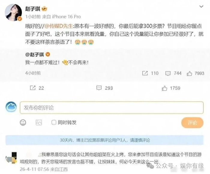 直播刚结束没几个小时,赵子琪就发了一条微博,她说自己一点不难过,以后也不会再来了,还转发了一位网友骂她的评论,那位网友说你这点流量也配上这个节目,她只回了一个哦好的,这话一出来,网上就吵起来了,有人觉得她态度太强硬,也有人觉得她是假装不在乎,实际上赵子琪没哭也没闹,反而让很多人开始琢磨,这节目到底想要的是情绪表演还是真实反应。