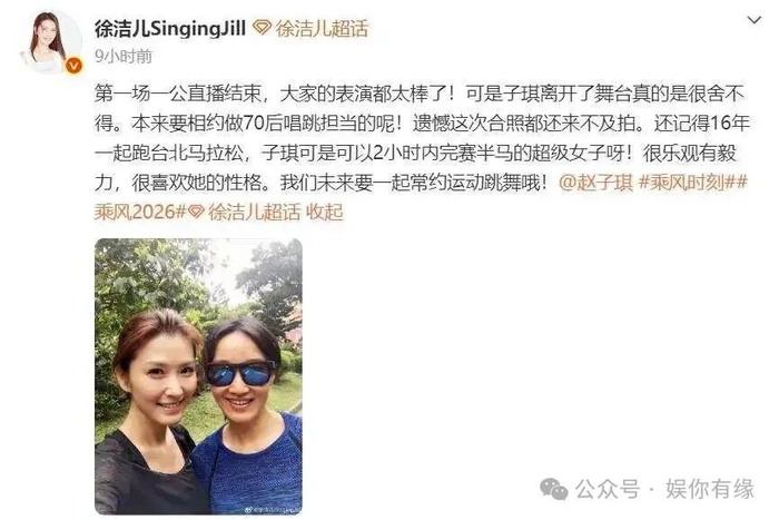 徐洁儿在凌晨发了一条长文,说起2016年她和赵子琪一起跑台北半程马拉松的事,她用了两小时就跑完,真是个超级女子,这和她在直播里轻松说出“早走比晚走好”连起来了,她好像真的不用节目来树立人设,也不用眼泪换取同情。